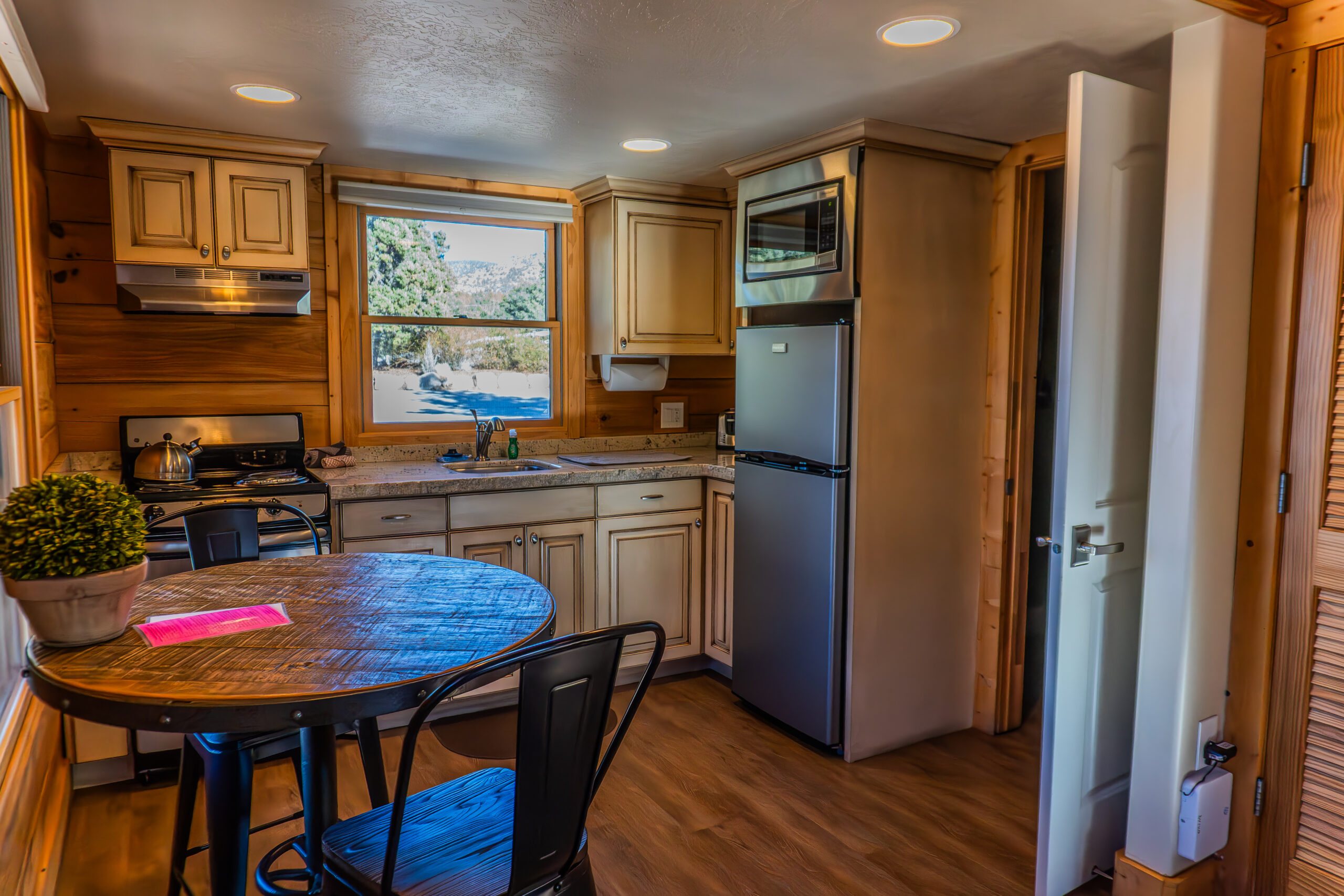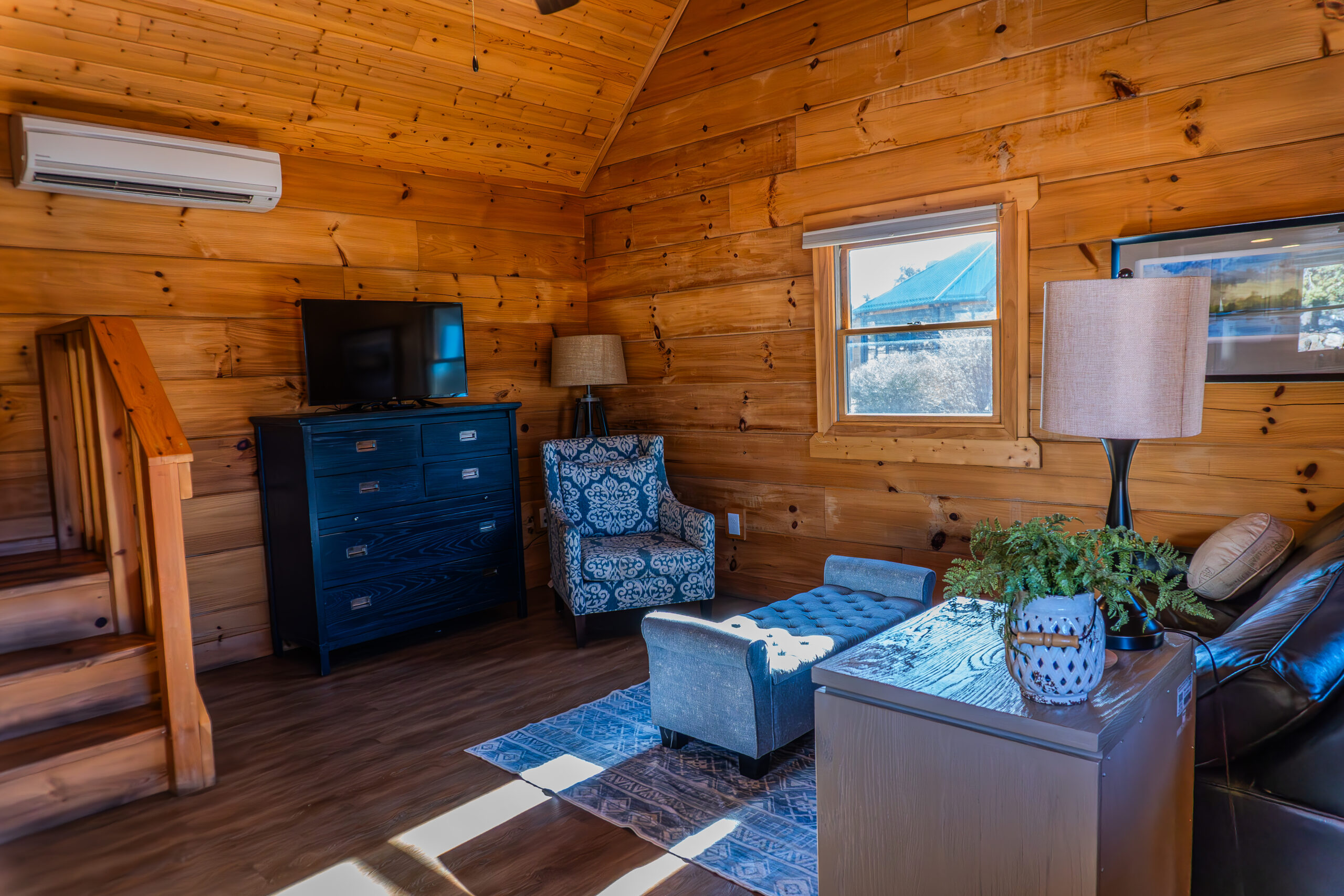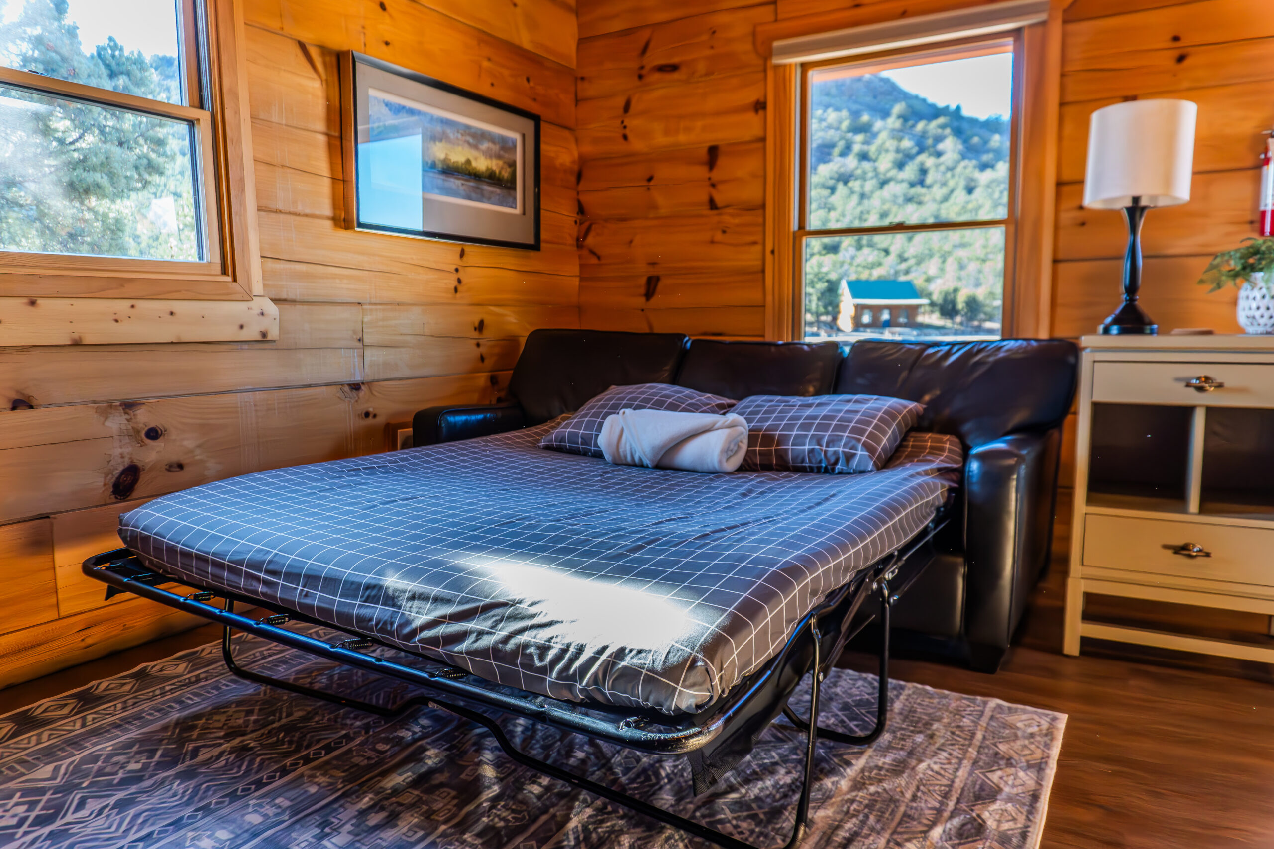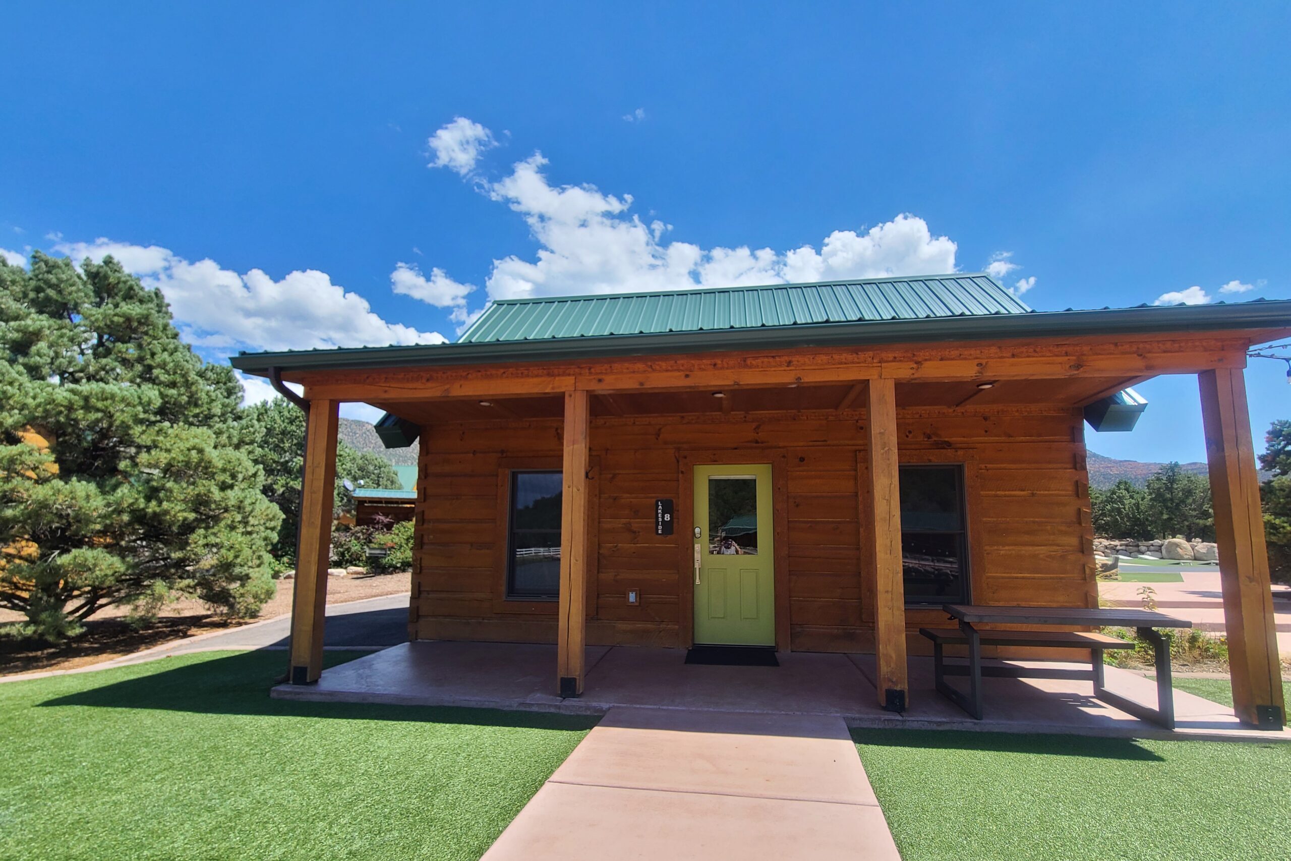Located Woodside on T. Rex Crossing, these cabins offer luxury and comfort in a rustic mountain setting. Each cabin features a kitchen with full-sized appliances, heat, air conditioning, free WiFi, Roku TV, full bathroom, a queen bed and twin rollaway bed in the bedroom and a twin size futon sofa in the living room. Outside there is a picnic table, porch furniture, and charcoal grill (bring your own charcoal & lighter fluid).