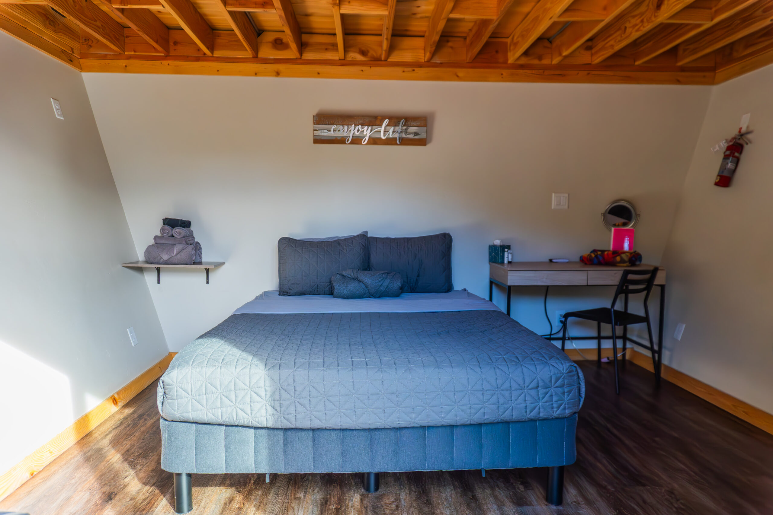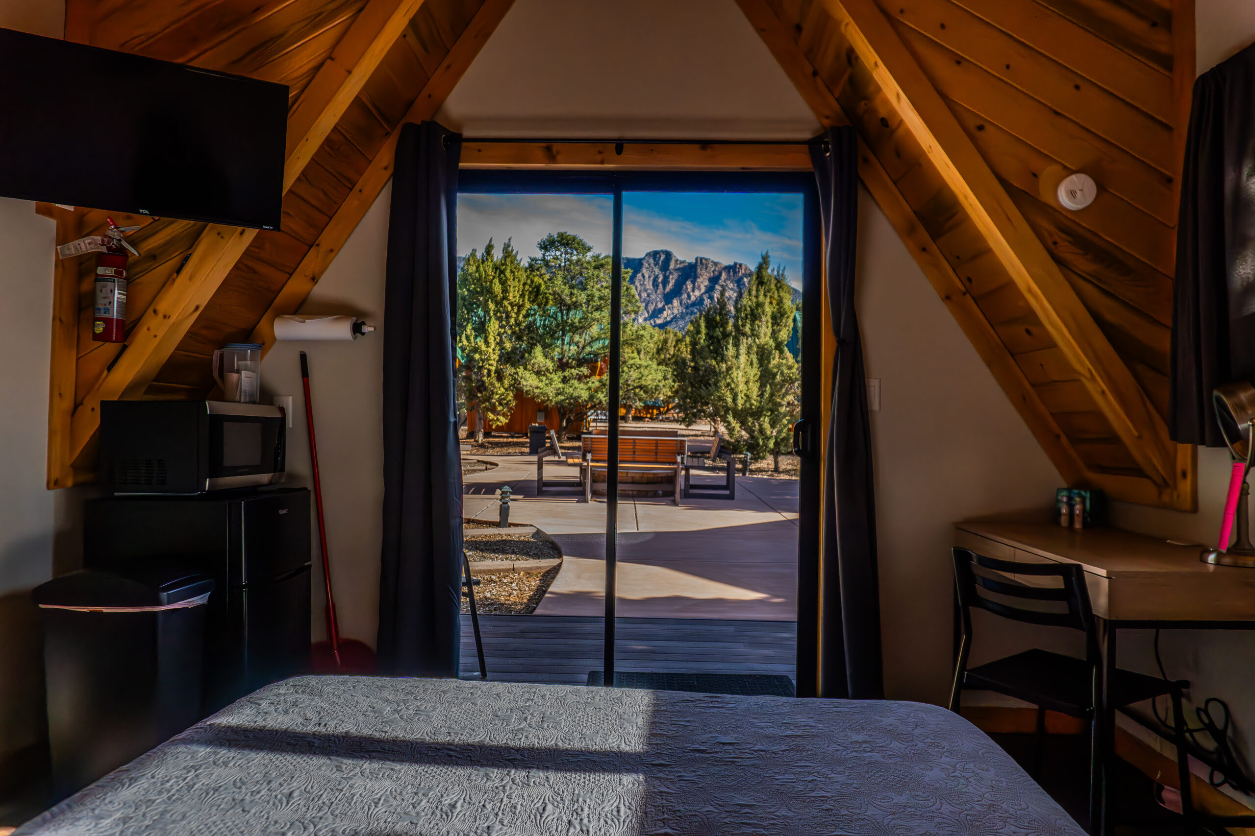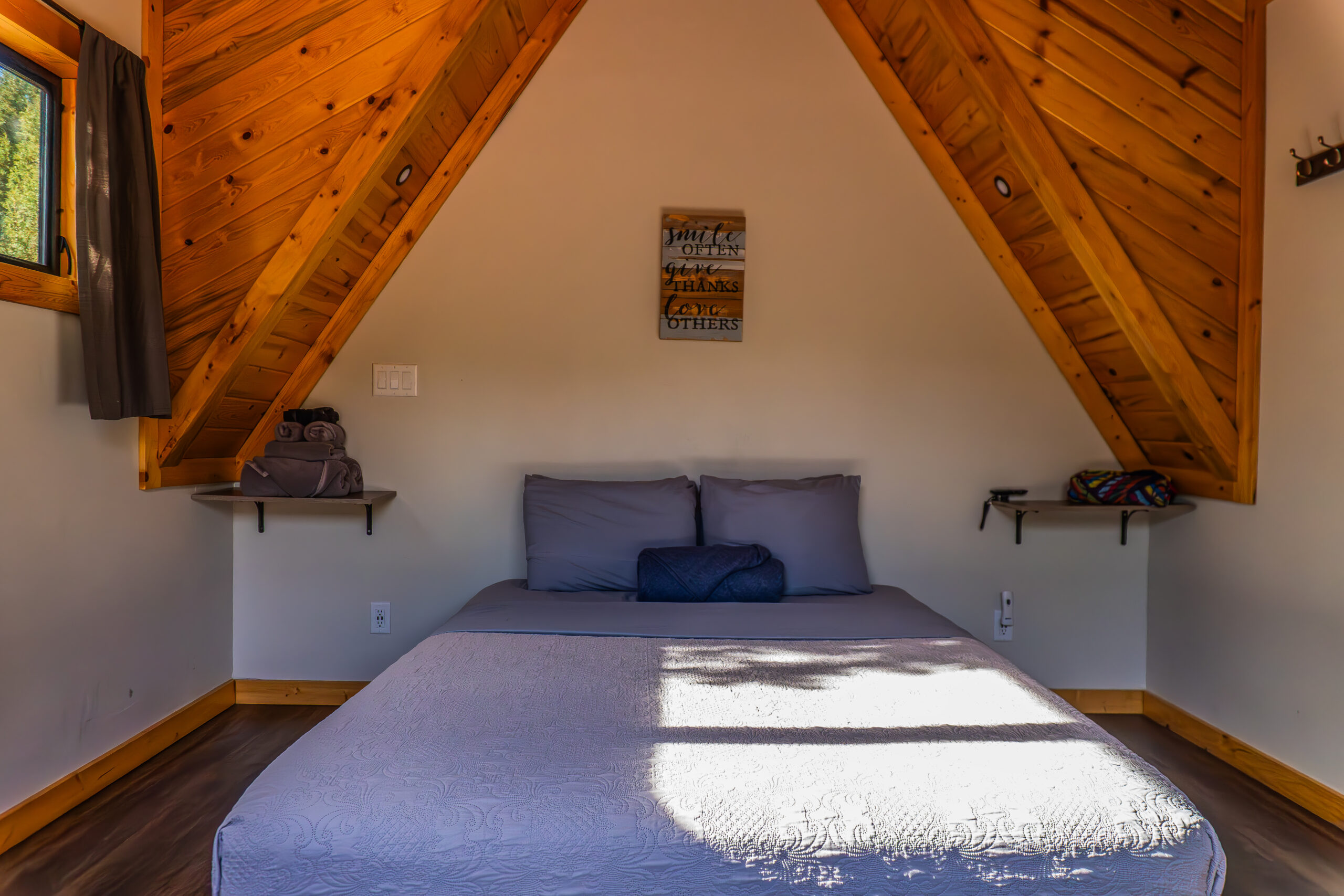 Want to go camping, but still sleep in a comfy bed? Then you want to go glamping! Glamorous camping at its best, our glamping cabins are the perfect combination of comfort and adventure. Sleep in the peaceful outdoors, in a ultra comfortable queen bed in one of our custom designed A-frame cabins. Complete with queen bed, desk, microwave, mini-fridge, heater, air conditioning, WiFi, Roku TV and electrical outlets in each cabin, you decide how much you of the world to leave behind. Fully equipped, shared bathrooms, complete with hot showers, are just a short walk away.