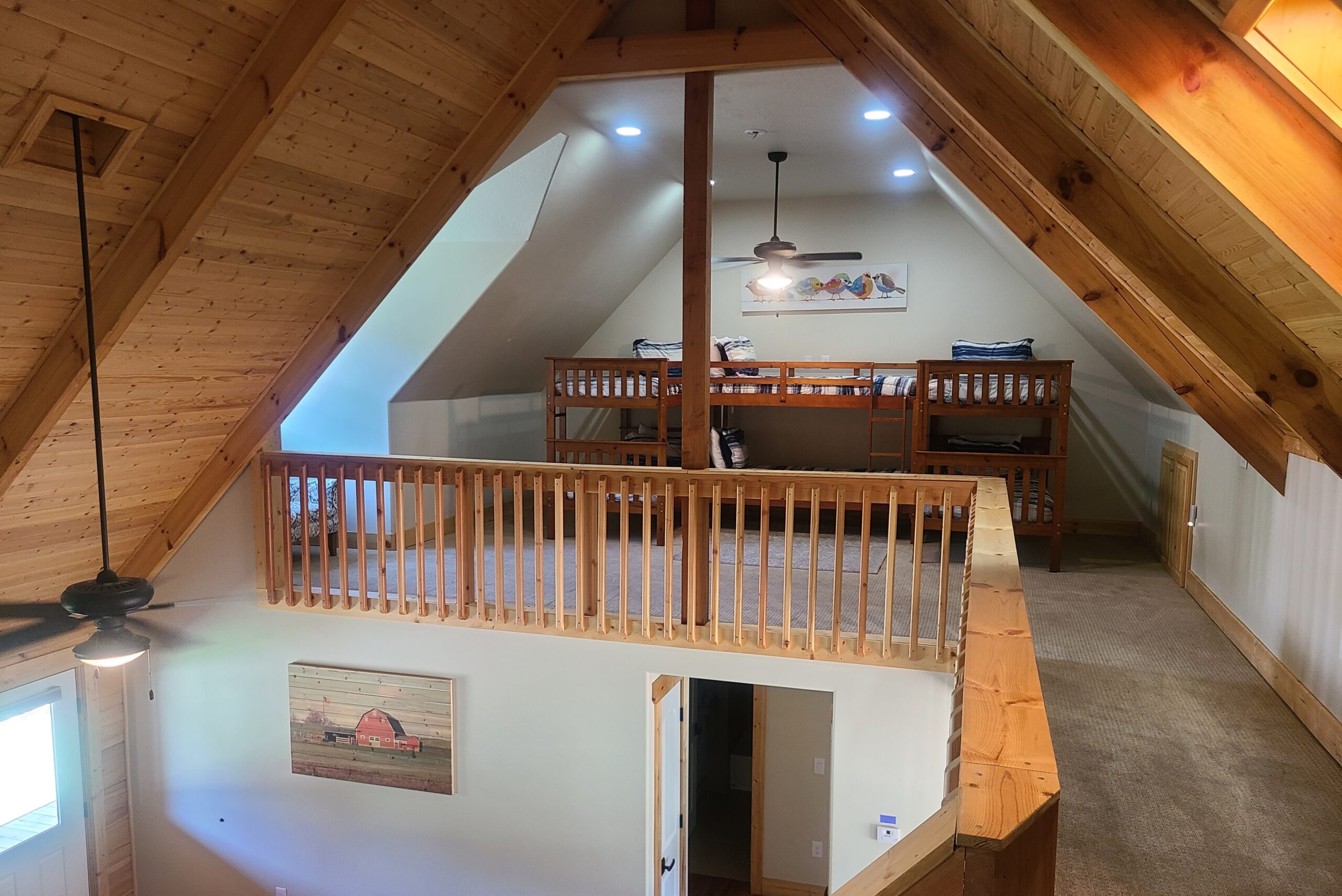 The perfect choice for a large family or group. The lodge features 3 private bedrooms with queen beds, 2 bathrooms, large kitchen, dining room, living room, and a spacious loft with a full bed and 3 sets of bunk beds. Stay in comfort with access to WiFi, Roku TV, and a fully equipped kitchen at close proximity to all lakeside activities. Need even more space? Add on our Lakeside Loft!